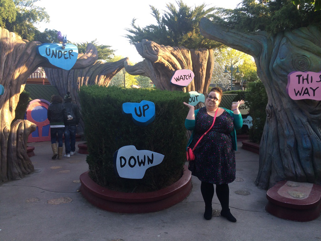 I arrived quite late in the day to the park so didn’t have long to explore before dinner on the first day, this meant that I didn’t change out of my travelling clothes – so no ears were worn on the first day! I did however wear a gorgeous dress from Yours Clothing (sadly, no longer available) which is covered in teeny tiny multi-coloured hearts. Turns out this was the perfect choice as I wandered around the Alice in Wonderland maze and had my photo taken with the queen of hearts!